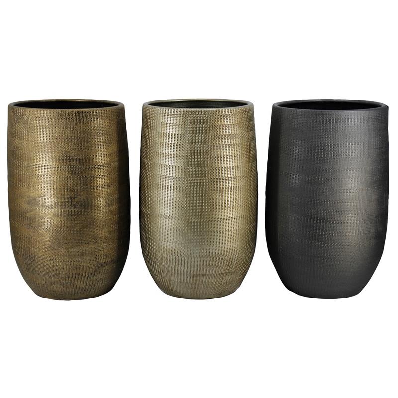 De Elsa bloempot uit de Floran collectie is per mixpallet te koop, in de kleuren goud, zilver en zwart.. Deze stijlvolle bloempot siert moeiteloos iedere ruimte. De bloempot heeft een bijzondere uitstraling met streepjes reliëf. Stijl hem af met wat hip groen en je hebt een sfeervolle blikvanger die zeker niet onopgemerkt zal blijven. De bloempot is gemaakt van keramiek, heeft de kleur brons en is rond van vorm