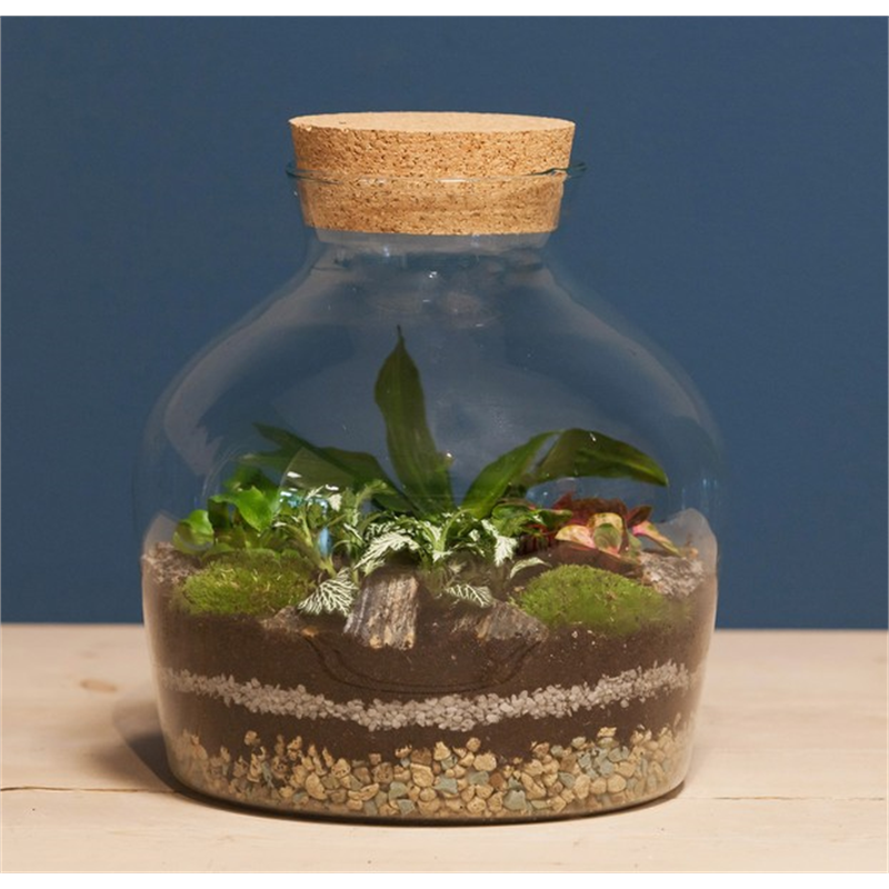 Maak je eigen terrarium met Bela Arte. Doordat er een kurk op de vaas zit blijft het vocht in de fles en creëert het een eigen klimaat waar de planten in groeien. Watergeven is hierdoor ook niet nodig. Zorg er voor dat de kurk er op blijft! Een eigen terrarium maken is niet moeilijk. In een paar simpele stappen heb je al een mooi resultaat. Met jouw eigen creatie haal je een stukje natuur in huis. Je bent in bezit van je eigen landschap in het klein. Voeg als extra aankleding elementen toe zoals mos, takjes of stenen. Je kunt zelf kiezen wat voor een soort landschap je wilt maken. Kies, bij een samengestelde begroeiing, soorten die bij elkaar passen in één milieu. Het is leuk om het kleine ecosysteem te volgen. Je hebt een mini wereld die zich in stand houdt en zich ontwikkeld. Zet jouw terrarium op een plek waar het licht is, maar niet in de volle zon. Halfschaduw is voor dit arrangement ideaal. Het glas is ook nog eens gemaakt van 100% gerecycled glas en daardoor erg duurzaam. Dat maakt het gevoel bij dit item nog beter!