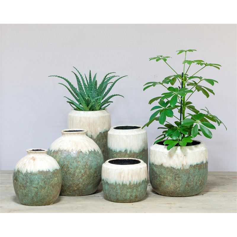 Die grün-weiße Oslo-Serie aus der Bela Arte-Kollektion von Floran ist aus glänzender, unregelmäßig glasierter Keramik gefertigt und fügt sich problemlos in jedes Interieur ein, um Ihre schönsten Pflanzen zu präsentieren. Handwerklich hergestellt, ist jedes Stück ein Unikat. Die Serie besteht aus 3 Größen von Töpfen, 2 Vasen und 2 Kugelvasen.