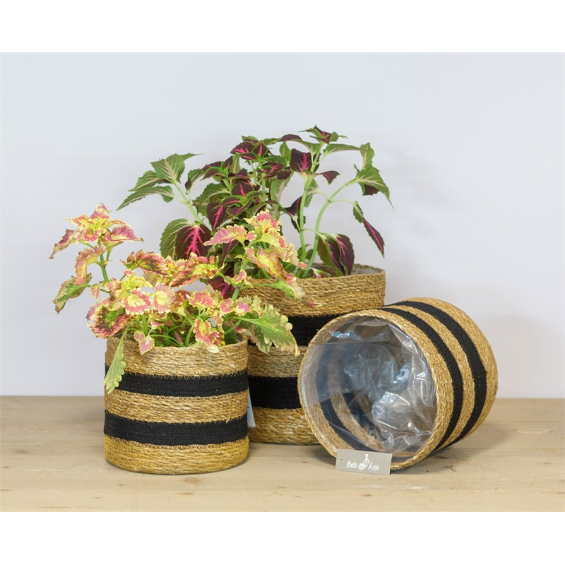 Cute handy seagrass basket with stripes is the set Tales from Floran's Bela Arte collection. The stripes are black in colour. It is a set of 3 baskets that also fit together if you want to store them when you don't need them for a while. Tales is made of beautiful natural and strong material that has a long lifespan. Baskets stay firmly in shape and have a plastic liner. Not only beautiful to put plants in but also a practical storage for small and large things lying around.