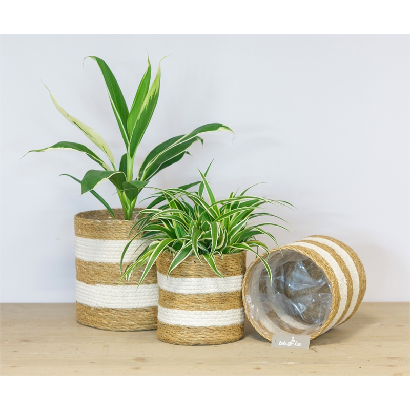 Cute handy seagrass basket with stripes is the set Tales from Floran's Bela Arte collection. The stripes are black in colour. It is a set of 3 baskets that also fit together if you want to store them when you don't need them for a while. Tales is made of beautiful natural and strong material that has a long lifespan. Baskets stay firmly in shape and have a plastic liner. Not only beautiful to put plants in but also a practical storage for small and large things lying around.