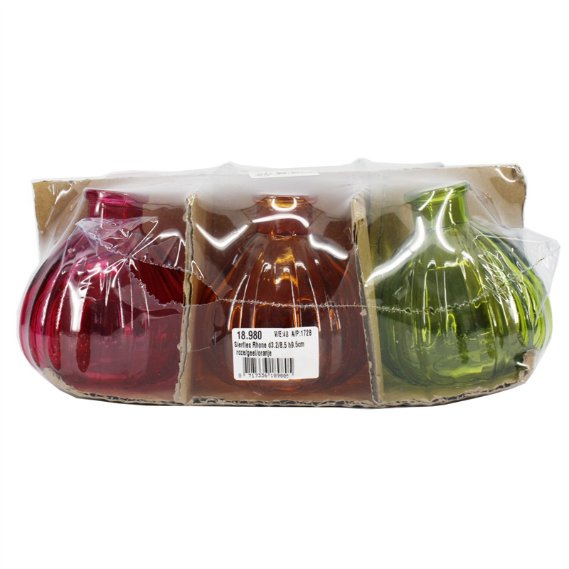 Ball bottle Rhone from Floran has a size of D3.5/8.5 H9.5cm and is available in an assortment of 3 colours, pink/yellow and orange. Go for unity with a set of vases in the same colour, or opt for a colorful whole by combining with Rhone or Thames.