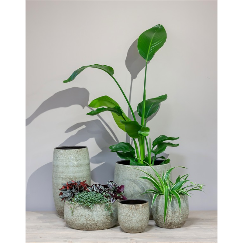 La série Olivier de la collection Bela Arte de Floran est un pot de fleurs robuste avec un émail vert et un aspect vieilli vintage grâce à la rayure verticale. La série Olivier comprend 6 tailles de pots, 2 tailles de vases et un bol.