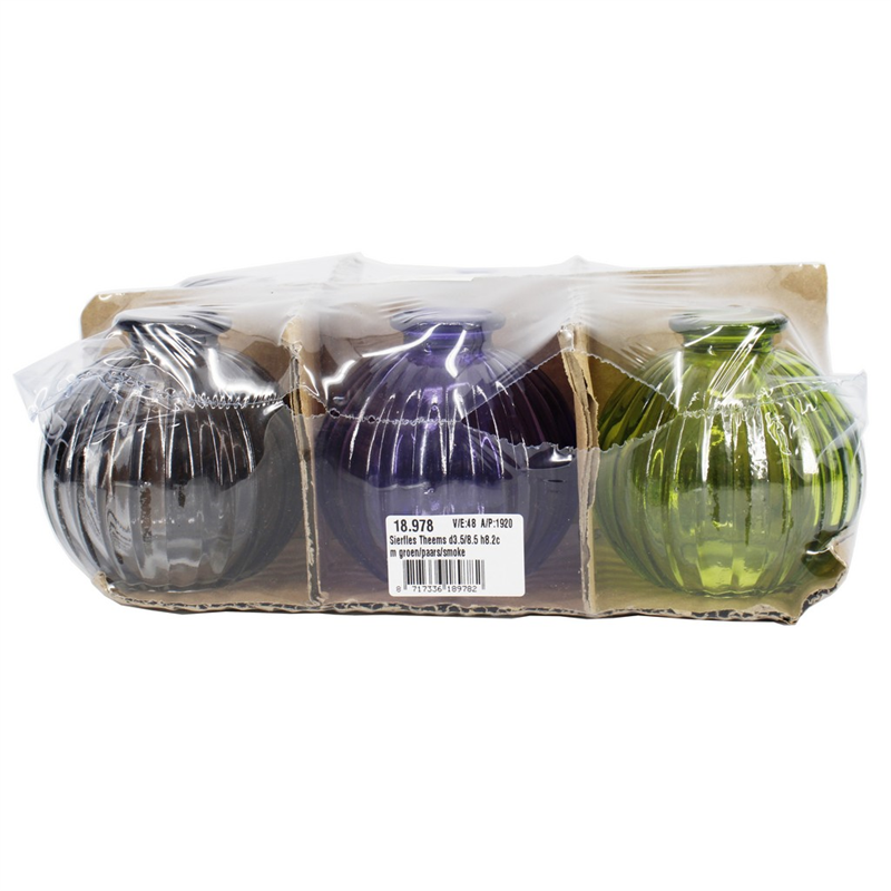 Bolfles Theems van Floran heeft een afmeting van D3.5/8.5 H8.2cm is verkrijgbaar in een assorti van 3 kleuren, groen/paars en smoke. Ga voor eenheid met een set vazen in dezelfde kleur, of kies voor een kleurrijk geheel door te combineren met Rhone of Theems.