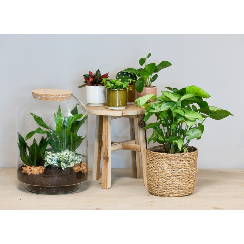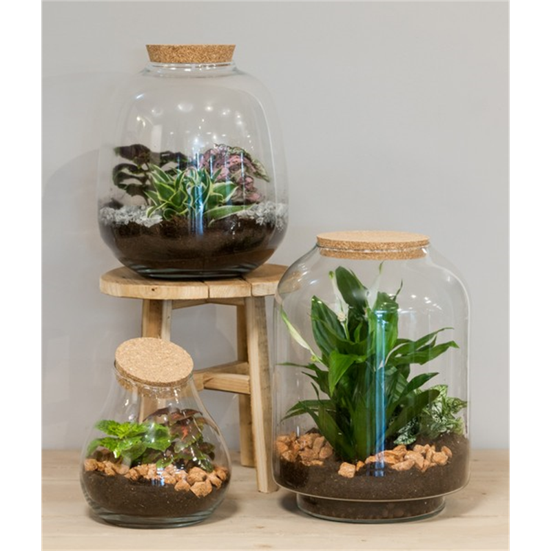 Maak je eigen terrarium met Bela Arte. Doordat er een kurk op de vaas zit blijft het vocht in de fles en creëert het een eigen klimaat waar de planten in groeien. Water geven is hierdoor ook niet nodig. Zorg er voor dat de kurk er op blijft! Een eigen terrarium maken is niet moeilijk. In een paar simpele stappen heb je al een mooi resultaat. Met jouw eigen creatie haal je een stukje natuur in huis. Je bent in bezit van je eigen landschap in het klein. Voeg als extra aankleding elementen toe zoals mos, takjes of stenen. Je kunt zelf kiezen wat voor een soort landschap je wilt maken. Kies, bij een samengestelde begroeiing, soorten die bij elkaar passen in één milieu. Het is leuk om het kleine ecosysteem te volgen. Je hebt een mini wereld die zich in stand houdt en zich ontwikkelt. Zet jouw terrarium op een plek waar het licht is, maar niet in de volle zon. Halfschaduw is voor dit arrangement ideaal.